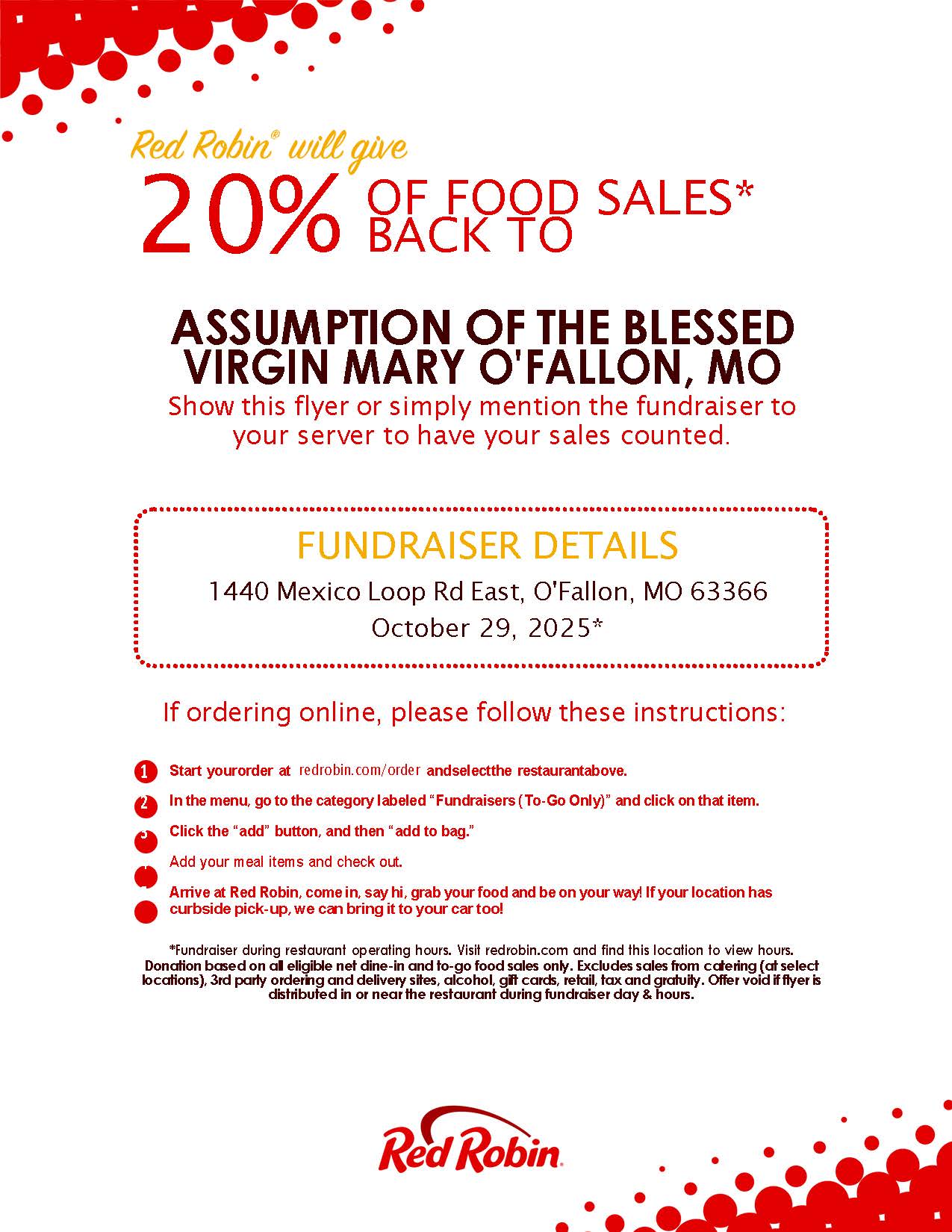 Oct 29 is the Red Robin Dining for Dollars event and Assumption receive 20% of the food sales on this day! Red Robin is located at 1440 Mexico Loop Road East in O'fallon. Oline ordering counts too!