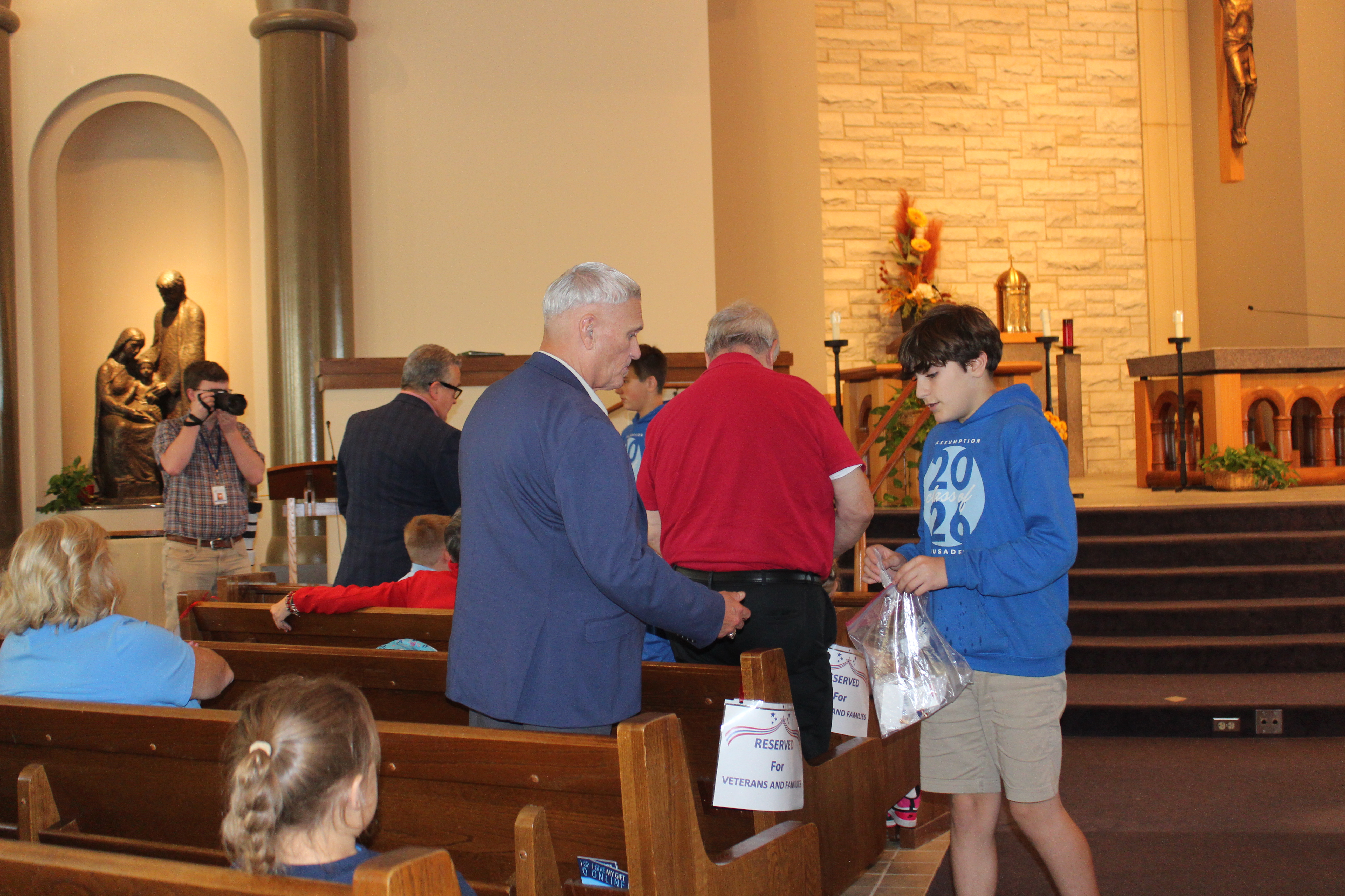 With hearts lifted in prayer in Assumption Church, the students shared blessings, presented prayer cards, and gifted a special pin to Veterans as a respectful token of appreciation for their sacrifice and service.