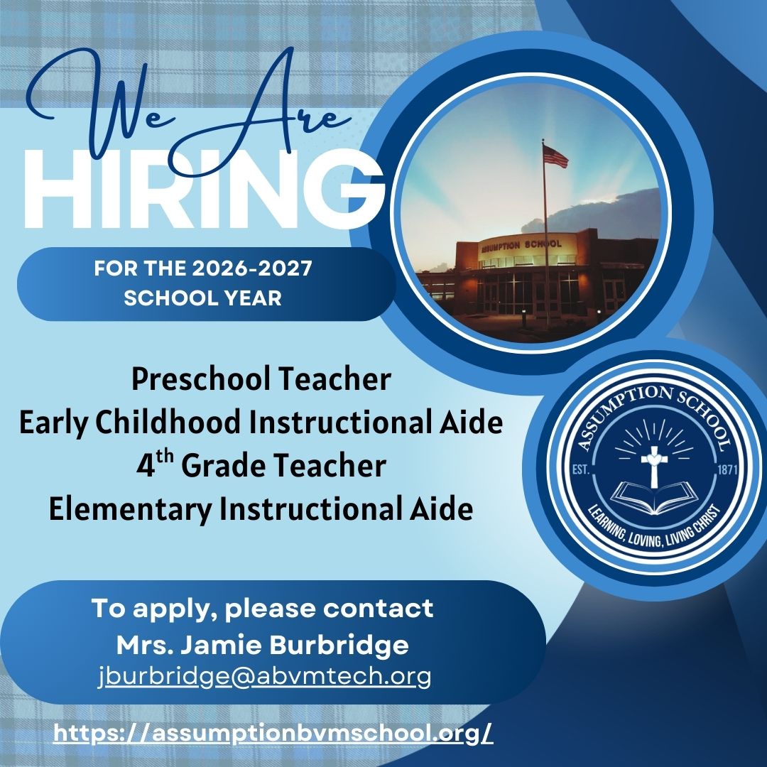 Interested applicants should contact Mrs. Jamie Burbridge, Assumption Principal, at jburbridge@abvmtech.org.